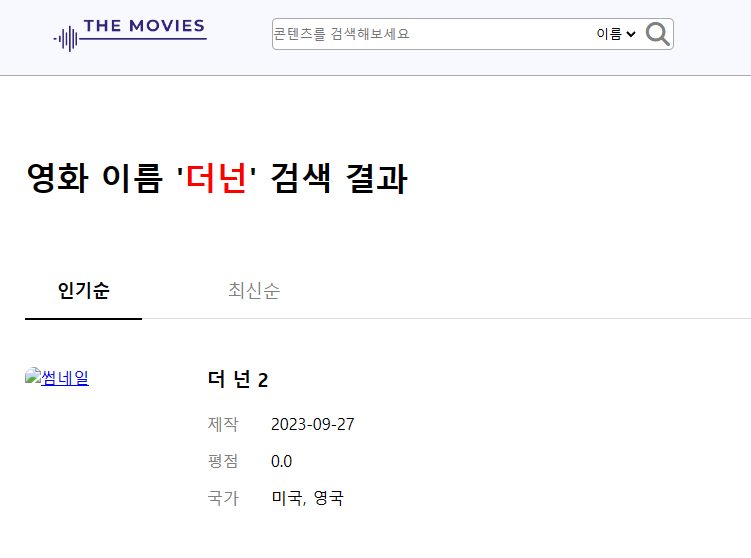 띄어쓰기를 하지 않고, "더넌"을 검색하였을 시, 띄어쓰기된 이름인 "더 넌 2"가 검색되는걸 확인할 수 있다.