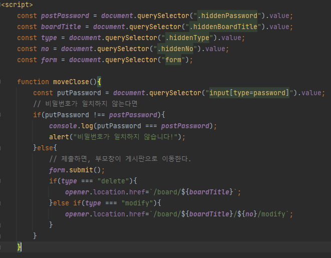 팝업창 html이다. 여기서 패스워드를 입력후 버튼을 클릭하면 된다. 버튼은 submit을 쓰지 않았다. 왜냐하면, 자바스크립트에서 해당 패스워드가 맞는지 아닌지 확인하고 제출을 해야 했기 때문이다. 그래서 form.submit을 사용하였다.