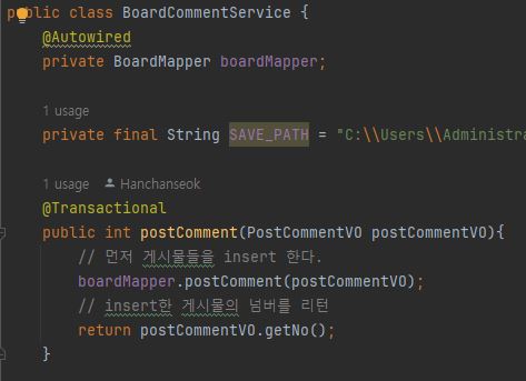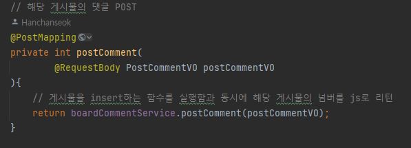 컨트롤러로 와서 게시물을 Post하는 서버에 해당 서비스의 함수를 실행시켜 게시물을 insert함과 동시에 해당 게시물의 넘버를 js로 리턴한다. (참고로.. boardCommentController인데 Restful 방식이다.)