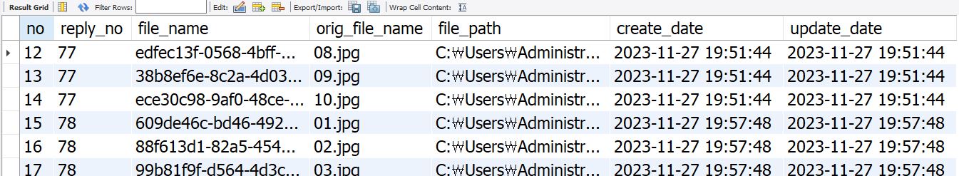 게시물 쓰고 파일들을 선택해서 등록한 결과, 이렇게 db에 잘 저장되는걸 확인할 수 있다.