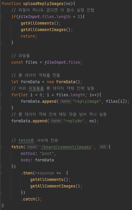 자바스크립트에 uploadReplyImages 함수를 만든다. 이 함수는 멀티파트파일로 선택한 파일들을 fetch로 서버에 보내서 db에 저장하는 역할을 한다. 폼 데이터 객체를 만들고, for문으로 여러 파일들을 폼 데이터 객체 안에 넣는다. 이때 "replyImage"라고 이름을 설정한다. 그리고 "replyNo" 이름으로 지난 포스팅에서 추출한 댓글 고유 넘버 역시 폼 데이터 객체 안에 넣는다. 그리고 폼 데이터를 fetch로 서버에 전송한다.