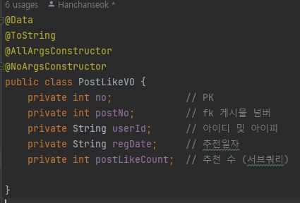 먼저 추천수 테이블을 나타내는 VO에 들어가서 서브쿼리로 만든 컬럼 이름 (int postLikeCount) 을 추가한다.