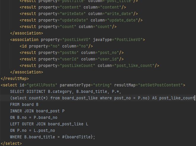 board 테이블과, board_post 테이블은 이미 조인되어 있었던 상황이었다.(게시판 이름(board)에 매칭되는 게시물들(board_post)을 조회해야 했기 때문) 나는 그 쿼리문을 다음과 같이 수정했다.