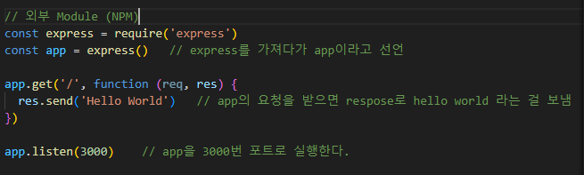 그리고 폴더 밖에서 해당 모듈을 불러올 경우 해당 폴더 경로를 require한 후 변수를 선언하고, 그 변수를 통해 함수를 불러오면 된다.