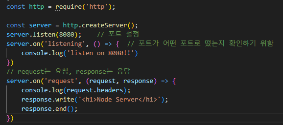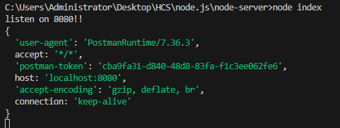 생성한 서버에서 request를 받아 처리할 수 있다. 요청보낸 헤더는 console.log를 통해 다음과 같이 출력된다.