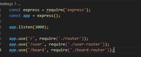 index.js 에서 app.get(), app.post() 등등 라우터가 많아질 경우 index.js 파일이 길어지는 문제가 발생한다. 그럴 경우 라우터를 여러개의 용도에 따라 분리해서 index.js 로 불러와서 쓸 수 있다. ( app.use() 를 이용 )