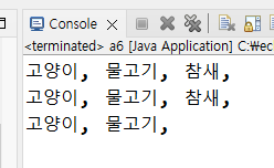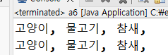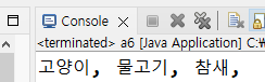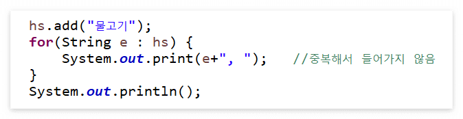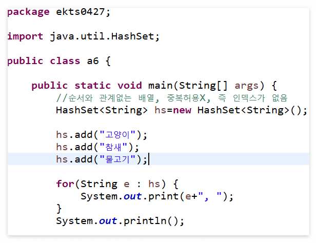 String 타입만 받는 Hashset을 선언한 뒤, "고양이", "참새", "물고기"라는 3개의 값을 집어넣었다.