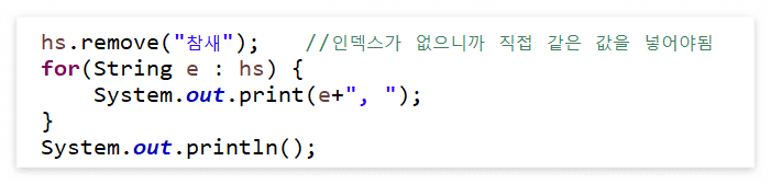 HashSet은 순서가 없어 인덱스의 개념이 없으므로 삭제를 할 때는, remove에 직접 값을 넣어야 한다.
