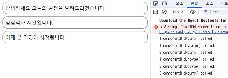생명 주기를 확인할 수 있는 함수를 작성한다. componentDidmount()는 마운트 되었을 시, componentDidUpdate()는 컴포넌트가 업데이트 되었을 시, componentWillUnmount()는 컴포넌트가 언마운트 되었을 시에 실행된다.