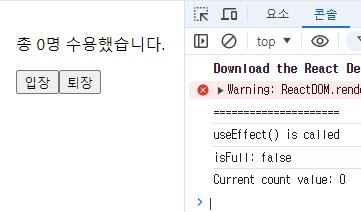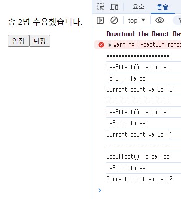 퇴장 버튼을 0이 될 때까지 누르고, 0이 되어서 계속 퇴장버튼을 눌러도 두개의 useEffect 훅 모두 호출되지 않는다. 의존성 배열인 count의 값이 변하는 것도 아니고, isFull의 상태 역시 변하는 것이 아니기 때문에 컴포넌트가 업데이트 되지 않기 때문이다.