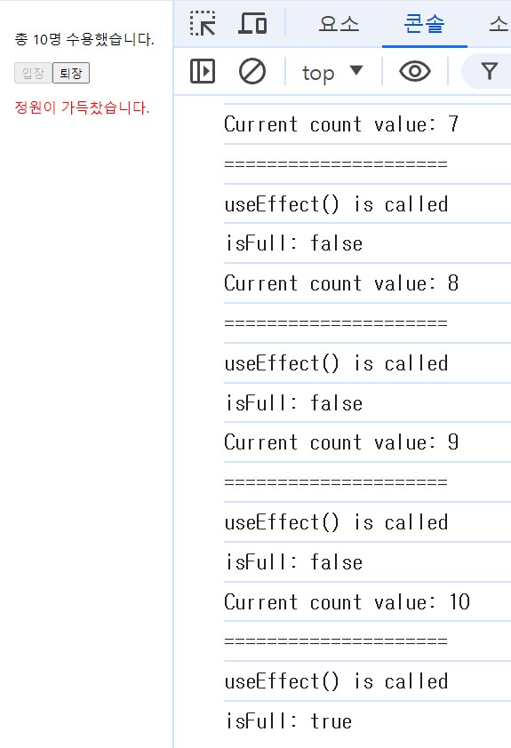 그러나 정원이 꽉 차게 된다면, 일단 두개의 훅이 호출되는데, 그 후 또 하나의 useEffect() 훅이 호출된다. 이는 정원이 꽉 차게 되어 isFull의 상태가 변하기 때문에 컴포넌트가 업데이트 되어, 정원이 꽉 차게 되었다는 걸 알리는 useEffect() 훅이 호출된다. 하지만 count라는 의존성 배열이 있는 useEffect() 훅은 카운트 값의 변화가 없기 때문에 호출되지 않는다.