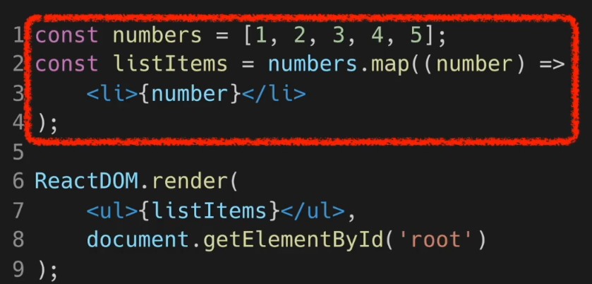 numbers 배열에 잇는 값들로 map() 함수를 이용해 listItems 라는 컴포넌트 배열을 만든다. 그리고 ul 태그안에 넣고 렌더링한다.