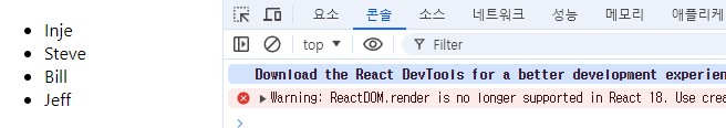 다음과 같이 map() 함수를 활용하여 student 배열에 있는 학생 이름들을 나열시켰다. 그런데, 문제는 map() 함수 사용 시, Key 값을 사용하지 않았기에 에러가 문구가 뜨는 것을 확인할 수 있다.