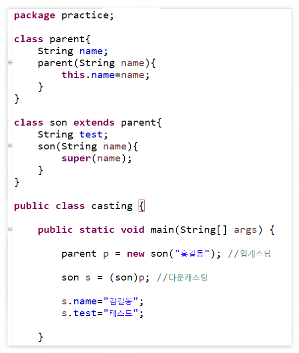 업캐스팅의 반대, 업캐스팅된 것을 다시 원상태로 돌리는 것이다. 다운캐스팅을 할때는 타입을 명시적으로 지정해줘야 함