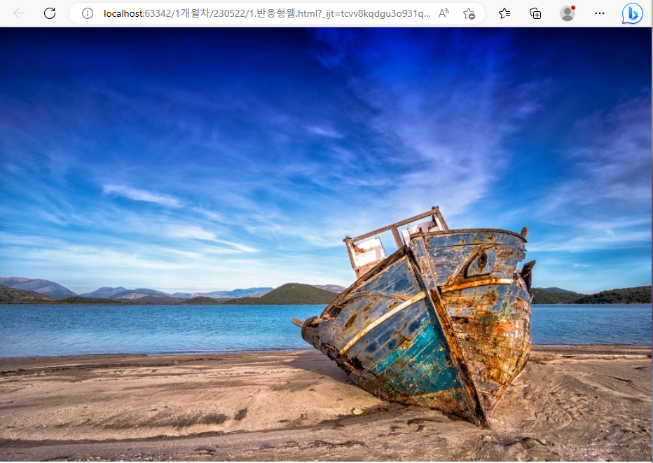 또 하나 더 적용해보았다. 더 작은 크기 768px 이하일 경우 백그라운드 이미지를 변경한다. 그리고 창 크기를 더 작게 줄여보면 또 다른 이미지 하나가 나타나는걸 확인할 수 있었다.