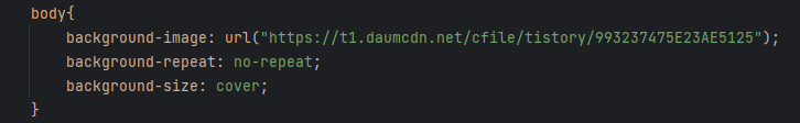 CSS에 백그라운드 이미지를 넣고, 이미지 반복을 없앤다. 그리고 모든 화면을 꽉 채우도록 백그라운드 사이즈에 cover를 설정한다.