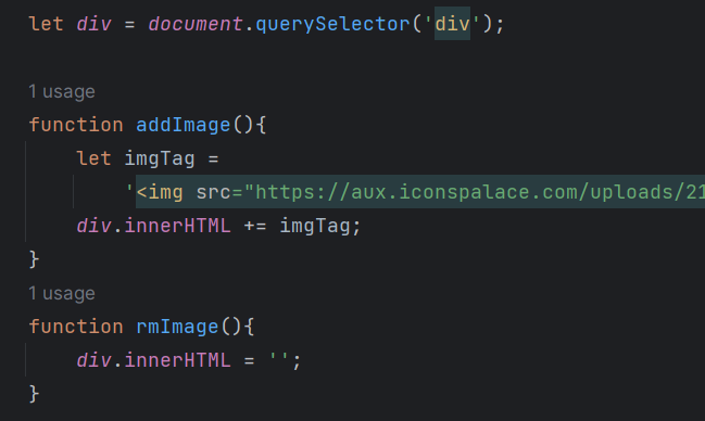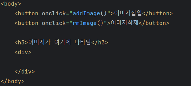 먼저 addImage()는 이미지 태그를 추가하는 역할을 하고, rmImage() 만들었던 이미지 태그를 삭제하는 역할을 한다.