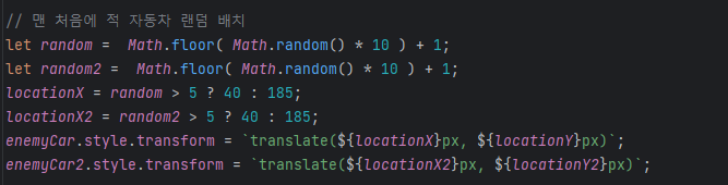 맨 처음 적 자동차 2개가 좌 혹은 우측에서 랜덤으로 나오게하기 위해 랜덤숫자를 이용했다. 1부터 10까지 랜덤 숫자가 설정되는데, 1에서 5까지는 적 자동차가 X축으로 185px(우측), 6에서 10까지는 X축으로 40px(좌측)에서 나타나도록 설정하였다.