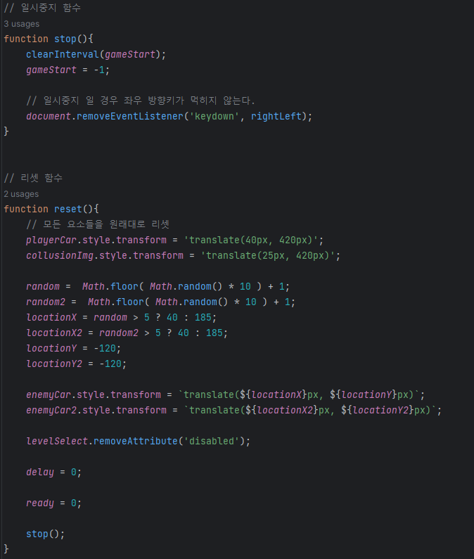 리셋함수는 자동차가 충돌했을 경우 모든 요소들을 원래대로 돌려놓기위해 만들었다. 내 자동차 위치도 원래위치(좌측)로 이동하게 했고, 충돌 이미지도 똑같히 설정했다. 적 자동차도 좌측 혹은 우측에서 랜덤으로 위치시켰고, 게임 시작했을 경우 누를 수 없었던 레벨 선택 input도 다시 활성화 그리고 stop함수를 실행시켜 게임을 멈춘다.