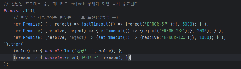 전달된 프로미스 중 하나라도 reject 상태가 되면 즉시 종료된다. 먼저 'ERROR-1초'는 resolve이기 때문에 넘어가고 그 다음 'ERROR-2초'는 reject이므로 콘솔창에 실패가 뜨고 즉시 종료된다. 그러니 다음 'ERROR-3초'는 전달되지 않는다.