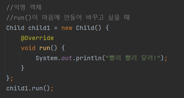 익명 객체를 이용하여 바꿀 수 있다. 그럼 Child 객체의 "빨리 달려!!" 가 아닌 새로 만든