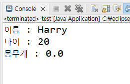 먼저 맨 처음에 정의한 생성자를 호출, 이름을 홍길동, 나이는 0살, 몸무게 0.0으로 설정하였고,