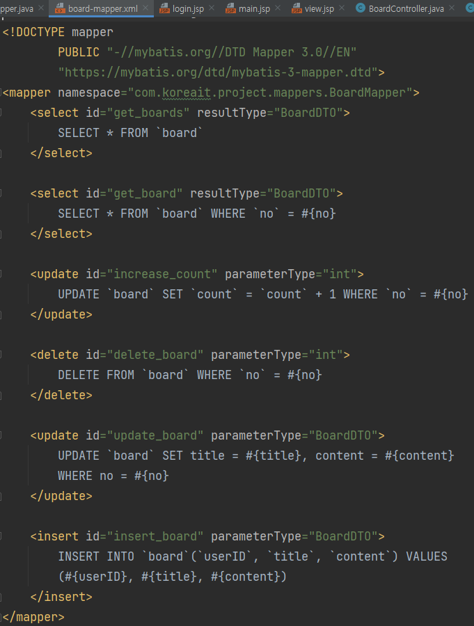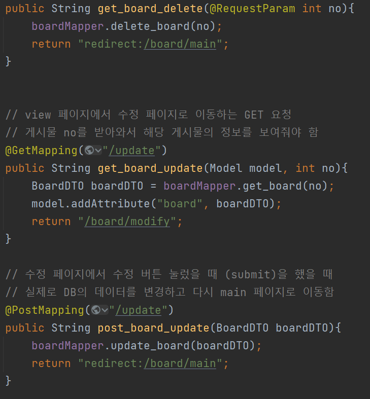 게시물 수정과, 게시물 삭제, 다음과 같이 수정 페이지에서 수정한 값들을 insert 문으로 매칭한 메소드를 불러와서 DB내용을 변경하는 방식으로 수정이 되도록 하였다. 게시물 삭제는 간단하다. 그냥 해당 게시물의 'no'를 불러와서 delete 문으로 매칭한 메소드를 이용하여 삭제를 진행.