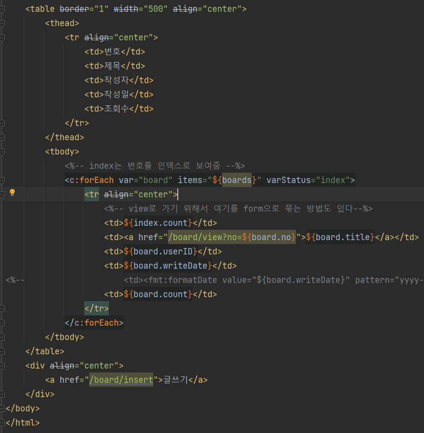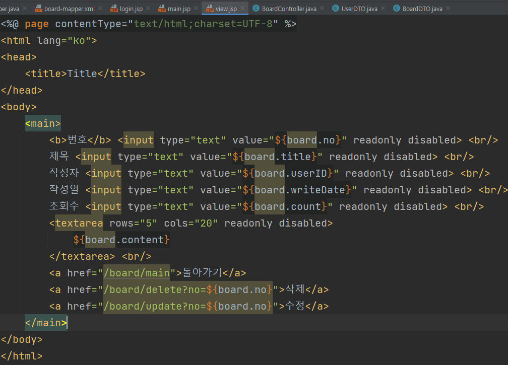 그 후 컨트롤러에서 코드문을 다음과 같이 작성, 게시판에 있는 모든 게시물 db들을 불러오게 하고, 게시물을 클릭했을 시, 게시물 하나의 데이터 정보들을 불러오게끔 하였다.
