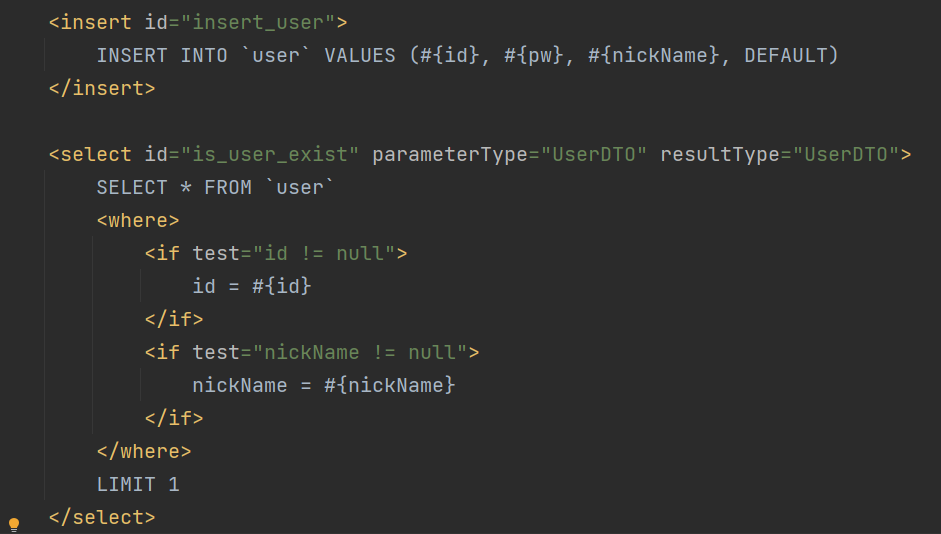 xml로 가서 쿼리문을 작성하고 매핑한다. 아이디가 null 이 아닐경우 해당 id의 정보를 조회하고, nickName이 null이 아닐 경우 해당 nickName의 정보를 조회한다. LIMIT 1로 단 한개의 정보만을 선택하도록 하였다.