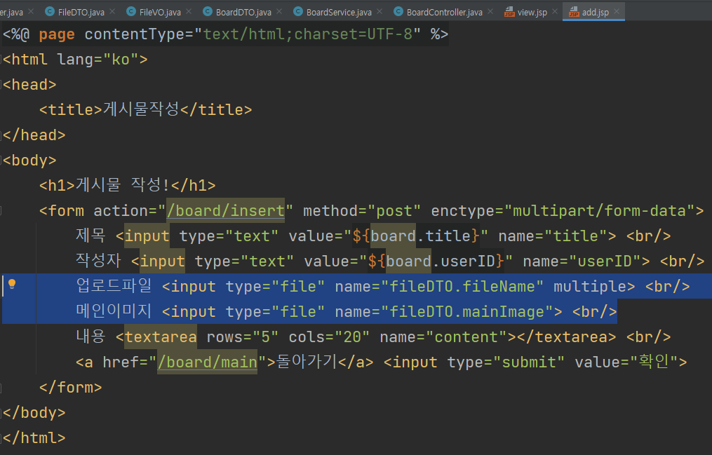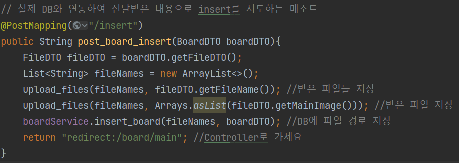 실제 DB와 연동 후 전달받은 내용으로 insert를 시도. boardService 클래스에 만들어 놓았던 게시물 작성 및 파일 업로드 메소드 insert_board를 불러온다.