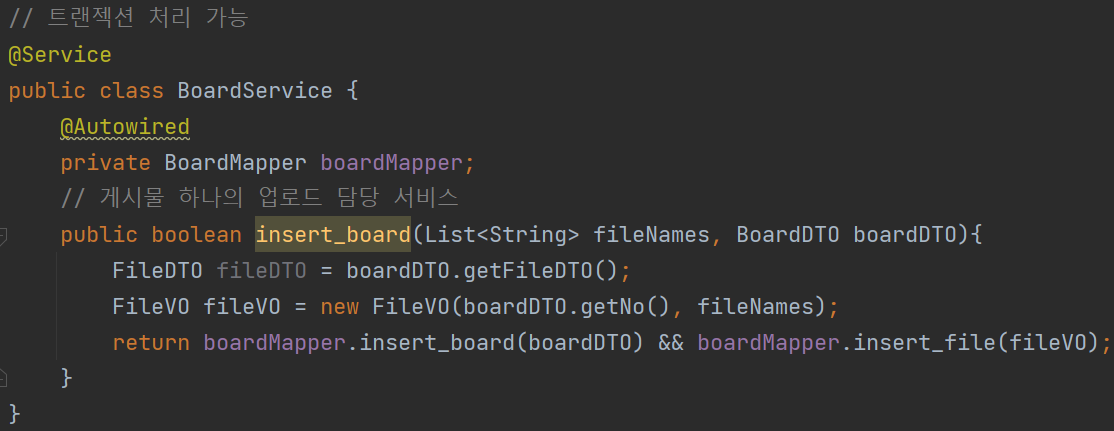 BoardService 클래스를 만든다. 여러개의 mapper를 트랜젝션 처리하는 용도이다. 게시물의 업로드와 게시물 안의 파일 업로드 기능을 동시에 한다. 이미 만들어놓았던 insert_board를 여기에 잘라낸다.
