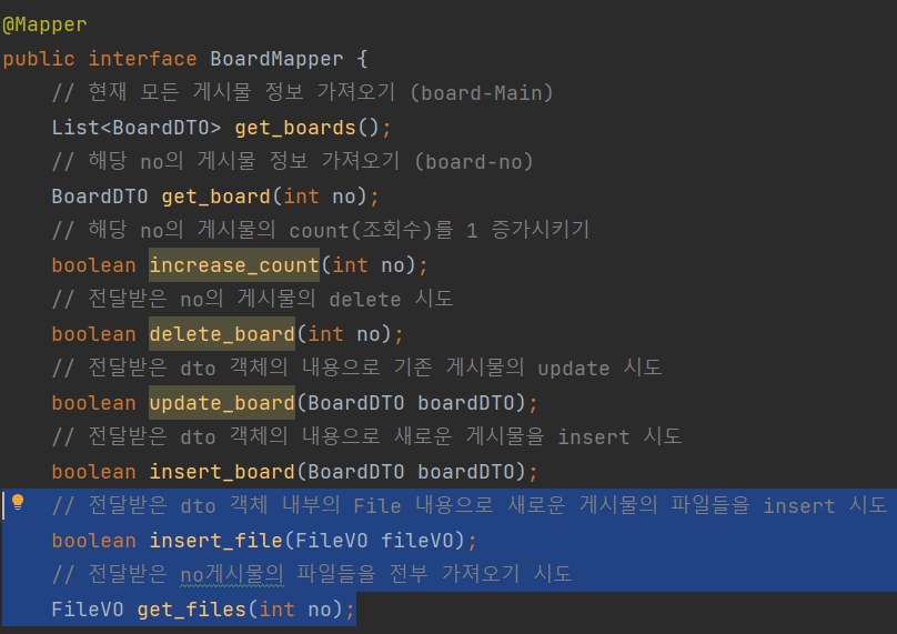 새로운 게시물의 파일들을 insert하는 쿼리문과, 전달받은 no의 게시물을 전부 가져오는 역할의 select문을 작성