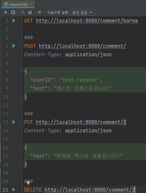뷰 없이도, 해당 요청이 정상적으로 실행되는지 확인할 수 있다. 작성후 실행 하면, 응답 코드가 뜨는데, 이 응답 코드로 요청이 정상 실행되는지 판단 가능하다. 만약 코드가 200번대라면 요청에 성공적으로 수행되었다는 뜻이고, 400번대는 사용자의 잘못된 요청으로 처리할 수 없음을 의미한다. 500번대는 내부 서버에 오류가 있음을 의미한다.