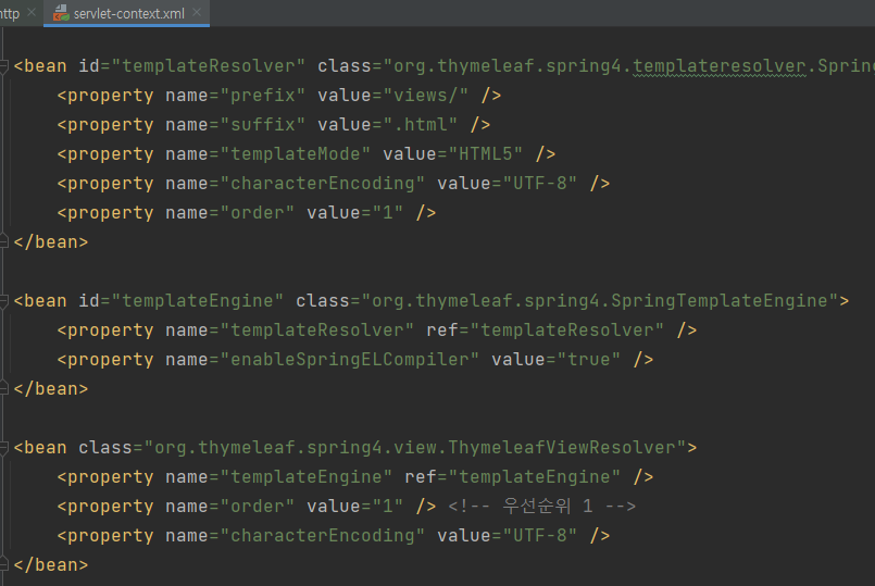 웹 어플리케이션에서 클라이언트의 요청을 받기 위한 컨텍스트 설정이며, 요청과 관련된 객체를 정의하는 servlet-context에 붙여넣기를 한다.prefix가 이 경로에서 파일을 찾는다는 뜻. 그리고 suffix는 어떤 타입의 파일을 찾을지를 의미한다. order로 우선순위는 1. 그리고 UTF-8로 인코딩을 설정하였다.