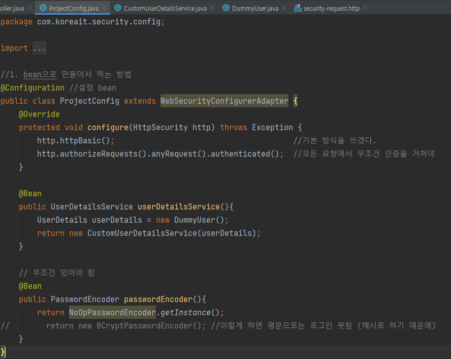 첫번째 BEAN으로 만들어서 관리하는 방식이 있다. 자격 증명이 있는 사용자를 하나 이상 생성하고, 사용자를 userDetailsService에서 관리하도록 추가한다. 추어진 암호를 UserDetailsService가 저장하고 관리하는 암호를 이용해 검증하는 PasswordEncoder 형식의 Bean을 정의