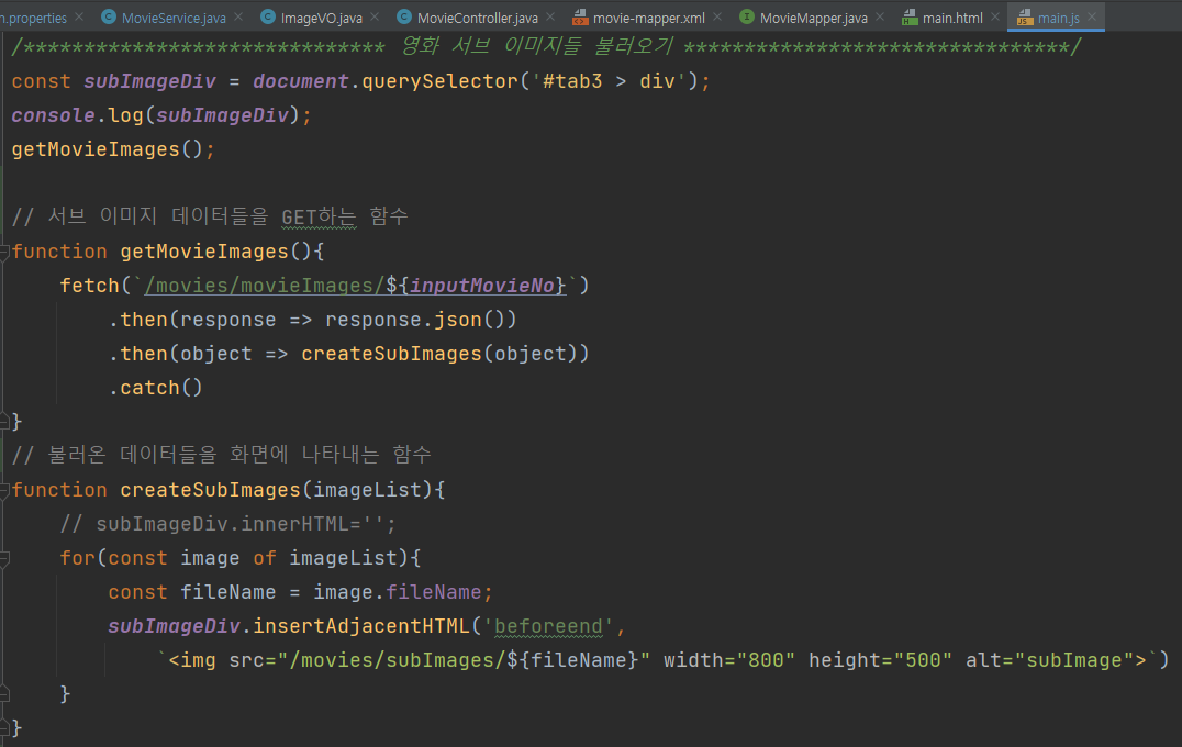 상세 페이지의 HTML에 걸리 자바스크립트에 가서, 서브 이미지 데이터들을 GET하는 함수와 불러온 데이터들을 화면에 나타내는 함수를 만들고, 실행하게 하였다. 이미 만들어놓은, 영화의 넘버를 가져오는 input hidden을 이용해 해당 영화의 넘버를 가져오게 하였고, HTML을 만들 때, 이미지의 주소를 위의 영화 이미지 주소를 적고, 불러온 데이터에서 각 영화의 파일 이름을 카테고리에 적용하여 이미지들을 불러오게 하였다.