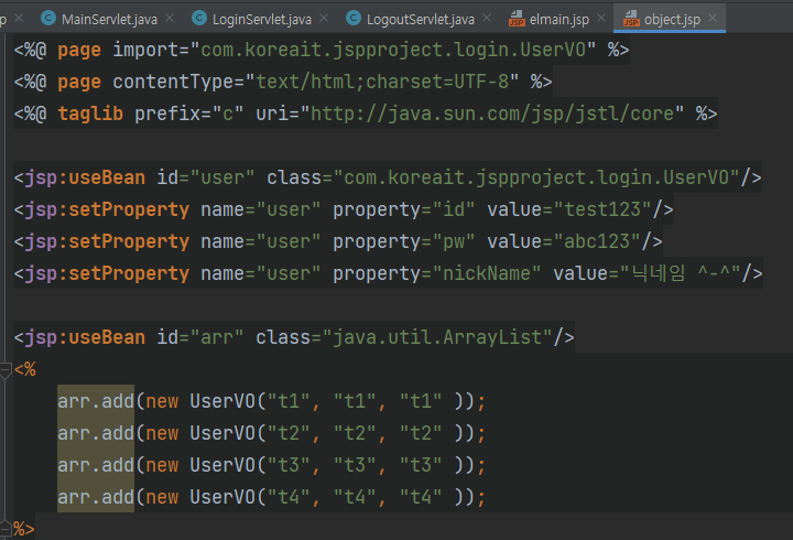 useBean을 이용하여 arr 리스트에 객체를 추가 한다.