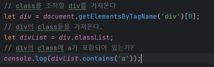 div의 class에 'a'가 포함되어있는지 확인 결과 true가 출력되었다.