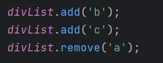 div의 class에 b와 c를 추가하고 a를 삭제하였다. 만약 add로 중복되는 값을 넣었다면, 더이상 추가되지 않는다.
