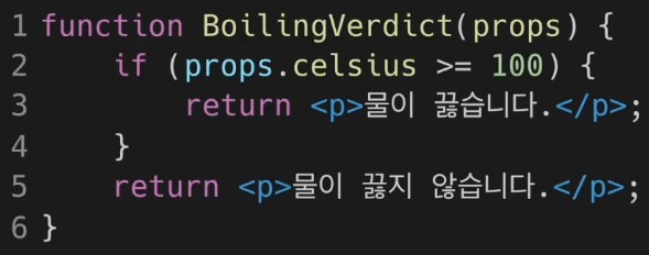 TemperatureInput 컴포넌트 사용 부분에서는 각 단위로 변환된 온도값과 단위를 props로 넣어주었고, 값이 변경되었을 때 업데이트 하기 위한 함수를 onTemperatureChange에 넣어줌. 즉 섭씨온도가 변경되면 단위가 'c'로 변경되고 화씨온도가 변경되면 단위라 'f'로 변경된다.