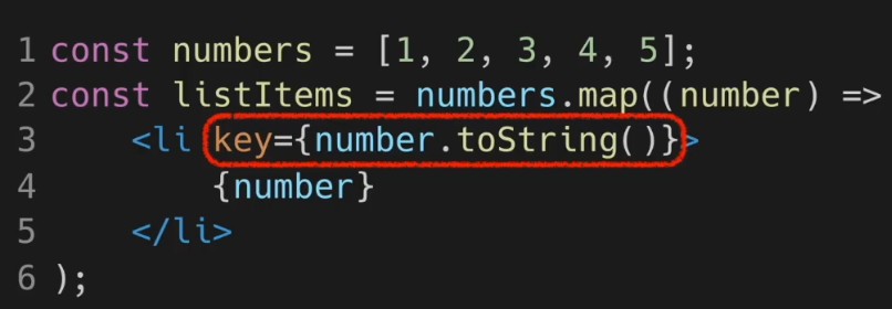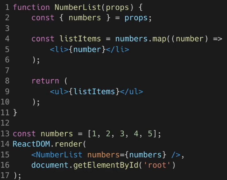 numbers 배열에 잇는 값들로 map() 함수를 이용해 listItems 라는 컴포넌트 배열을 만든다. 그리고 ul 태그안에 넣고 렌더링한다.