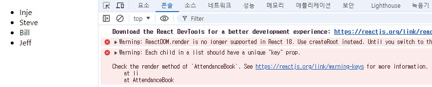 다음과 같이 map() 함수를 활용하여 student 배열에 있는 학생 이름들을 나열시켰다. 그런데, 문제는 map() 함수 사용 시, Key 값을 사용하지 않았기에 에러가 문구가 뜨는 것을 확인할 수 있다.