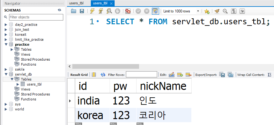 먼저 servlet_db 스키마에 users_tbl이라는 테이블을 만들고, 데이터들을 저장한다. 이 데이터들이 회원가입이 되어있는 아이디, 패스워드, 닉네임이다. 모두 not null을 설정하였고, id는 PK, nickName은 unique로 설정