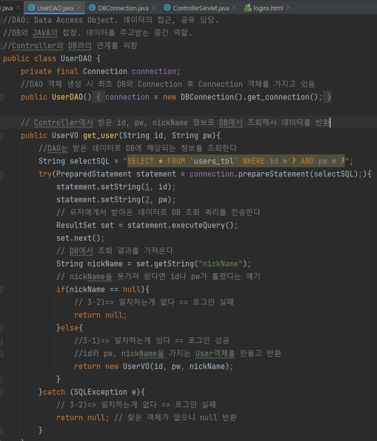DAO는 데이터의 접근 공유 담당이다. DB와 JAVA의 접점으로 데이터를 주고받는 중간 역할을 한다.