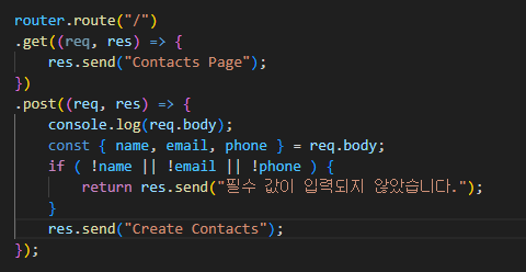 이들 중 값이 하나라도 없다면 res.send()를 이용해 '필수 값이 입력되지 않았습니다.'로 메세지를 띄울 것이다.
