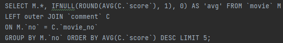 movie와 movie_category 테이블에 데이터들을 여러개 추가했다. 위는 movie 테이블과 comment 테이블을 join하여 각 영화와 각 영화의 평점들을 함께 나타내게 하였다. limit 5로 5개의 영화만 순서대로 나타난다.