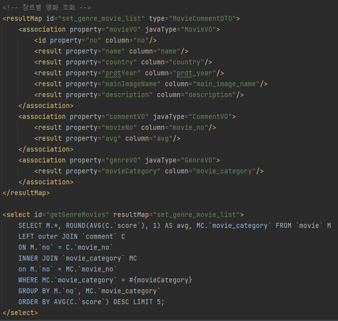Join을 한 쿼리문이기 때문에 resultMap을 써야한다. MovieCommentDTO를 만들어 쿼리문에 필요한 VO들을 집어 넣고 association에 각 VO를 입력한 뒤, result에 vo 안에 있는 변수들을 집어 넣으면 된다.