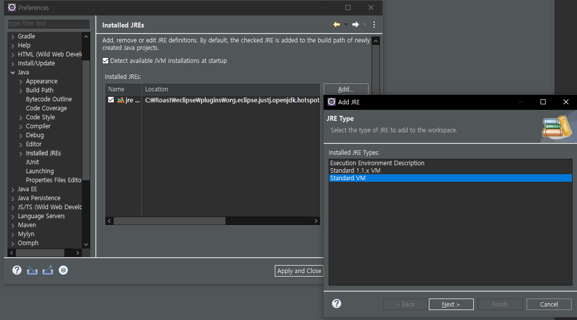 이클립스 누르고 해당 워크스페이스로 주소 설정 후, 이클립스에 들어가서, window -> Preference 클릭