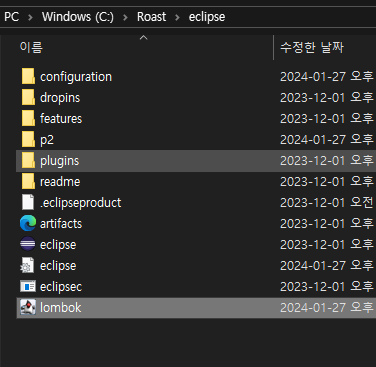 lombok.jar 를 다운로드 후 이클립스 폴더에 넣고
