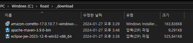 Corretto와 이클립스, maven을 해당 폴더에 압축을 푼다. 그리고 maven_repository 폴더와 eclipse-workspace 폴더를 만든다.